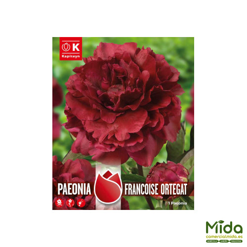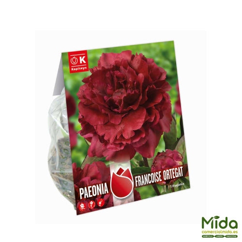 La Peonía ‘Françoise Ortegat’ es una variedad clásica (1850), celebrada por su fragancia intensa y sus flores dobles de rojo oscuro con matices borgoña de gran elegancia. Perteneciente al grupo Paeonia lactiflora, presenta tallos firmes y follaje verde que estructura el macizo con bajo mantenimiento. Es excelente flor de corte por el tamaño de sus capítulos y la buena sustentación del tallo, aportando distinción a ramos y arreglos. En pleno sol y suelo fértil y bien drenado, ofrece brotación vigorosa y apertura pareja, consolidándose como una planta longeva y rústica que permanece años en el mismo lugar. Su color profundo suma carácter a borduras y parterres clásicos o contemporáneos.